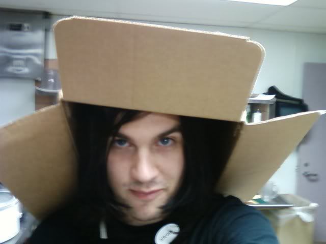 me at work. I'm trying not to let the box fall on my face. I work at a bowling alley. A Brunswick Zone to be specific.